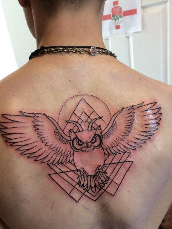 男生后背上黑色几何线条小动物猫头鹰纹身图片