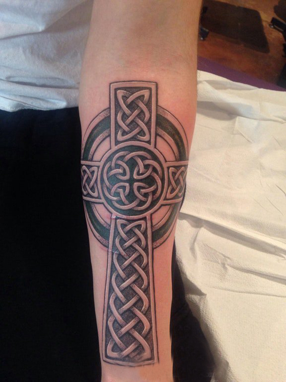 女生手臂上黑灰点刺几何线条十字架纹身图片