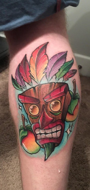 男生小腿上彩绘几何抽象线条羽毛和面具纹身图片