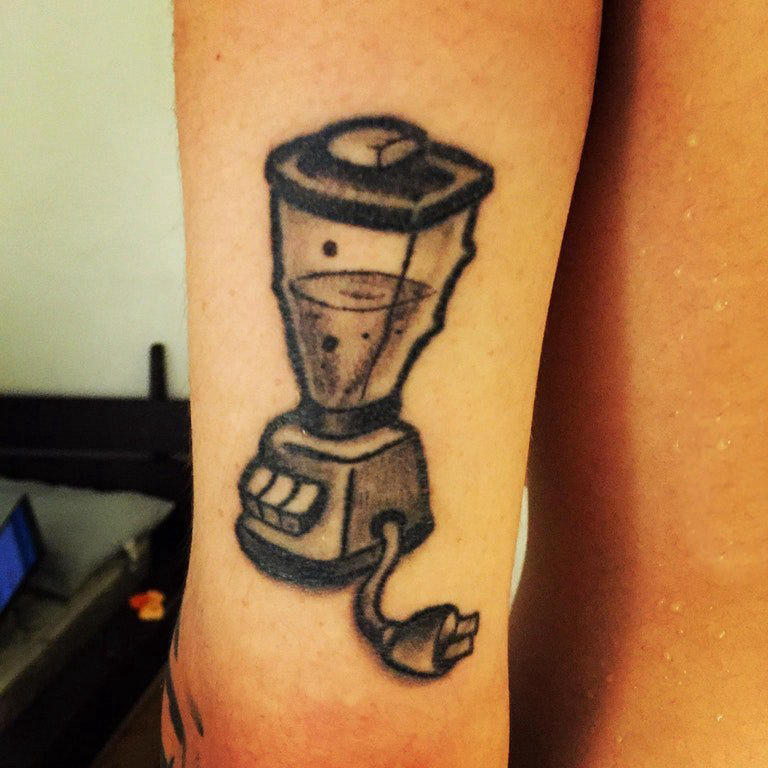 男生手臂上黑色点刺几何线条榨汁机工具纹身图片