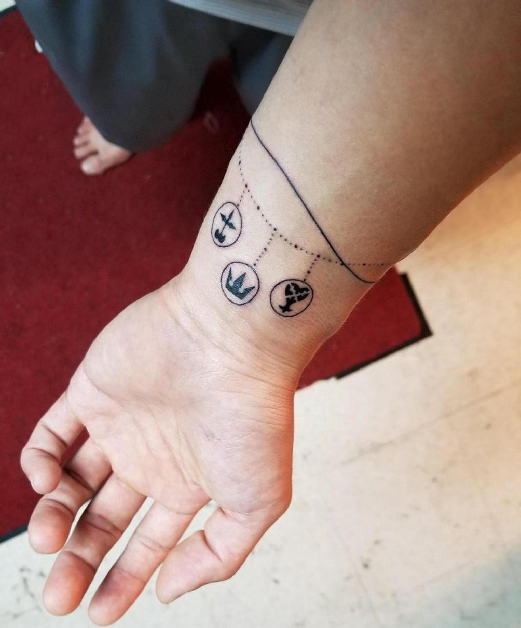 男生手臂上黑色几何简单点线创意手链纹身图片