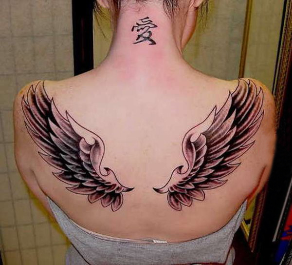 女生背部黑灰素描点刺技巧创意霸气翅膀纹身图片