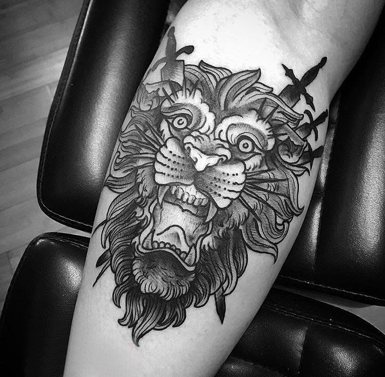 狮子头纹身图片小腿上黑色双剑刺入狮子头纹身图片