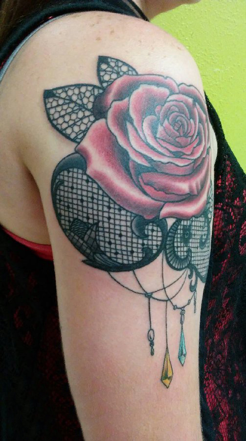 纹身玫瑰花 美女手臂上立体小纹身玫瑰花和蕾丝花边纹身图片