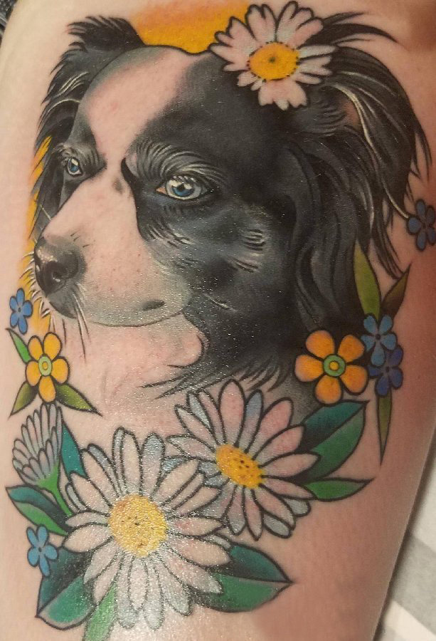 小狗纹身图片 女生大腿上花朵和小狗纹身图片