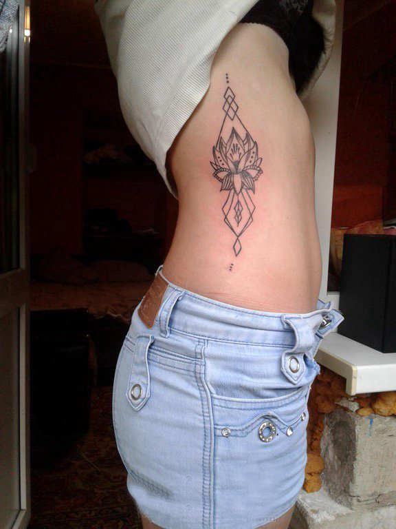 侧腰莲花纹身 女生侧腰上黑色的莲花纹身图片