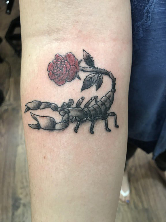 手臂纹身素材 女生手臂上玫瑰和蝎子纹身图片