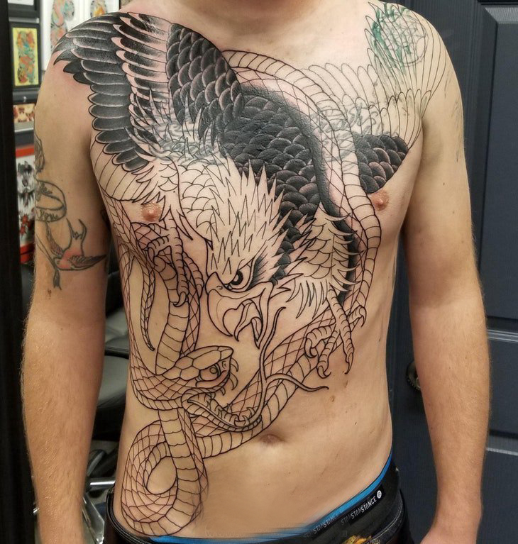 纹身胸部男 男生胸部蛇和老鹰纹身图片