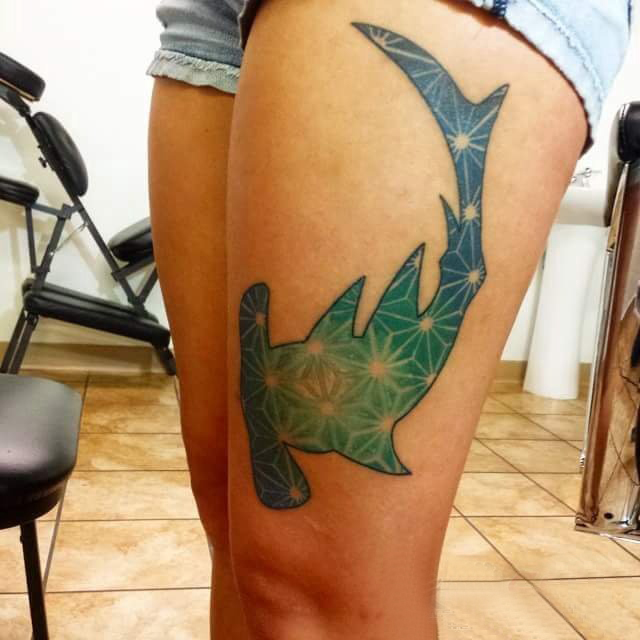 百乐动物纹身 女生大腿上彩色的锤头鲨纹身图片