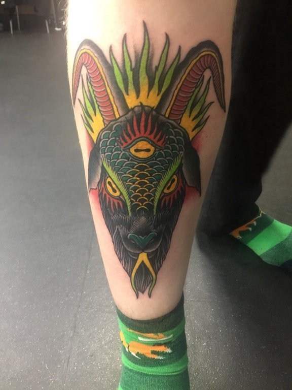 羊头纹身 男生小腿上彩色的羊头纹身图片