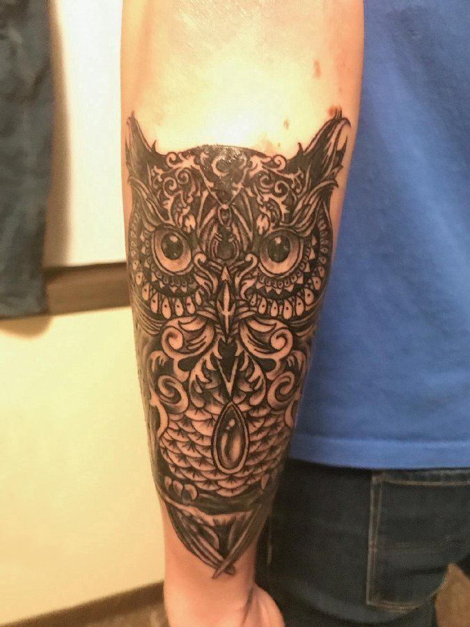 猫头鹰纹身图 男生手臂上黑色的猫头鹰纹身图片