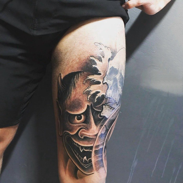 般若面具纹身 男生大腿上骷髅和般若纹身图片