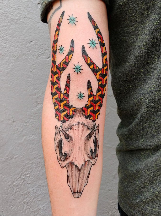 羊头骨纹身 男生手臂上彩色的羊头骨纹身图片