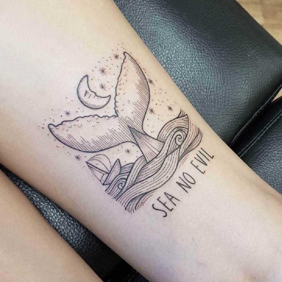 纹身鲸鱼 女生手臂上英文和鲸鱼尾纹身图片