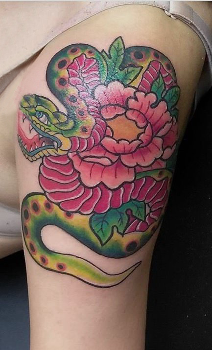 大臂纹身图 男生大臂上蛇和牡丹纹身图片