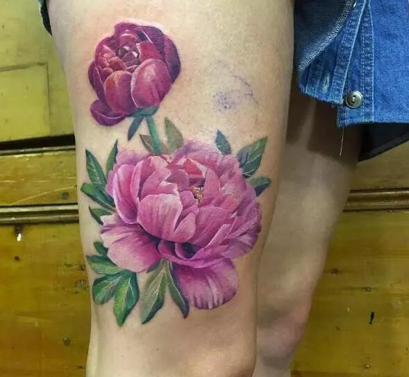 新传统大腿牡丹纹身的