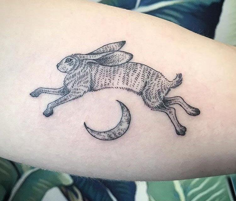 小动物纹身 女生小腿上月亮和兔子纹身图片