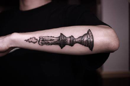 小臂上的匕首和器具黑灰点刺纹身图案欣赏