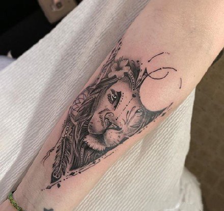 • 包大臂和小臂的9款黑灰色写实狮子纹身图案