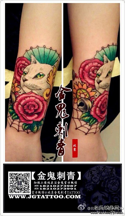 腿部时尚可爱的猫咪与玫瑰花纹身图案