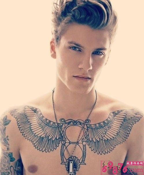 欧美男生胸前个性沙漏翅膀纹身