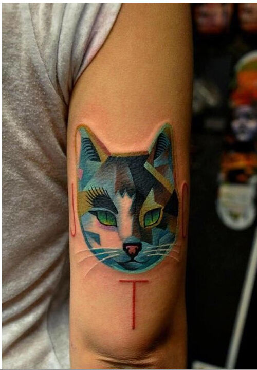 手臂上漂亮好看的彩色猫头像纹身图案图片