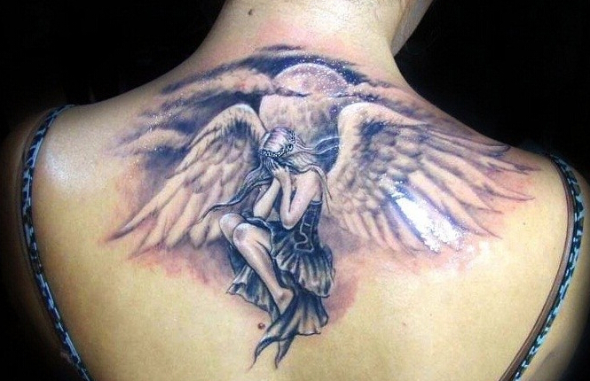 女性后背上哭泣的天使纹身