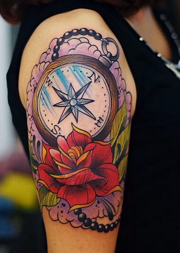 手臂彩色玫瑰指南针纹身图案