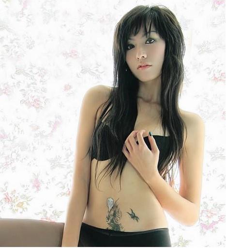 漂亮妹妹腹部蝴蝶和花卉纹身