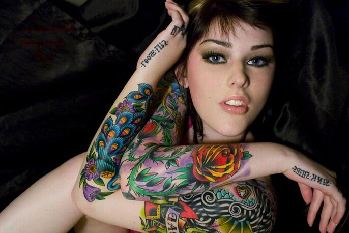 美女展示个性双花臂纹身