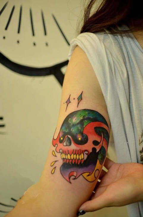 炫彩星空骷髅手臂纹身