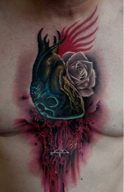 男生前胸超酷的骷髅心脏刺青