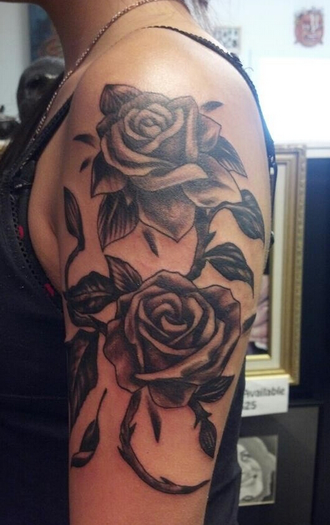 女性手臂上黑灰玫瑰纹身