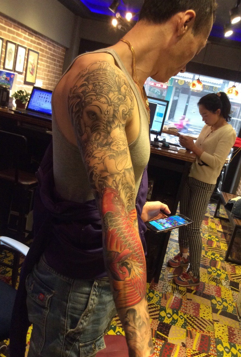 象神与鲤鱼结合的花臂纹身图片