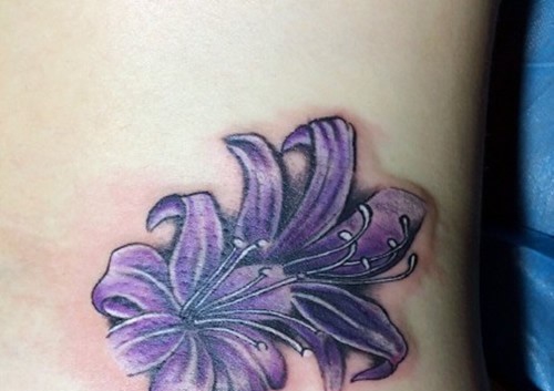 • 背部紫色百合花彩色泼墨纹身图案