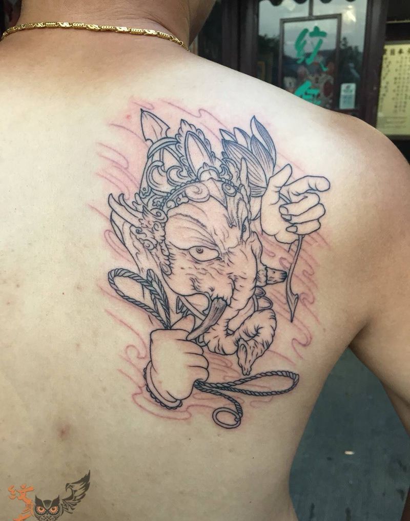 大象 水线完事纹身图片_手稿背部欧美传统鬼神宗教动物人物纹身图案