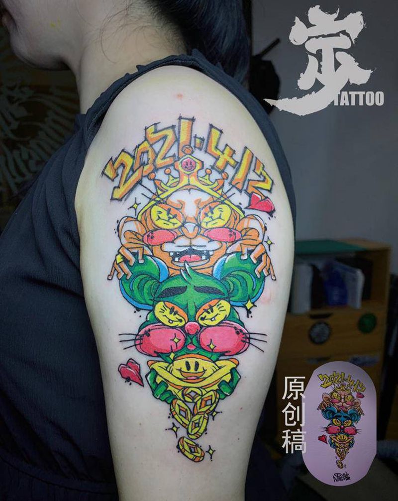 美式美发猫+暴力遮盖纹身图片_手臂New School纹身图案