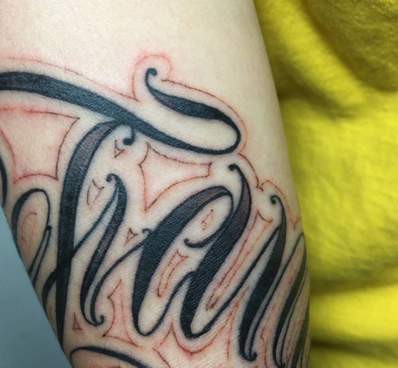 手写字纹身图片_肩部手部点刺花体字花体字英文字纹身图案