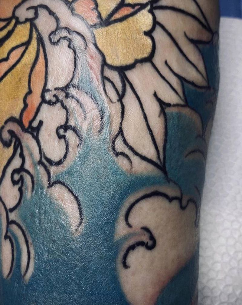 合作款 未完纹身图片_腿部点刺素花纹身图案