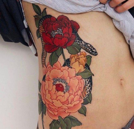 日式蛇牡丹传统纹身图