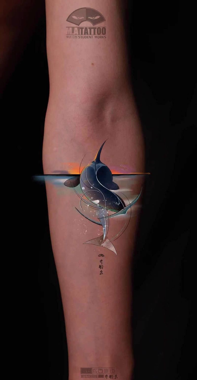 鲸纹身图片_胸部背部水彩水墨纹身图案