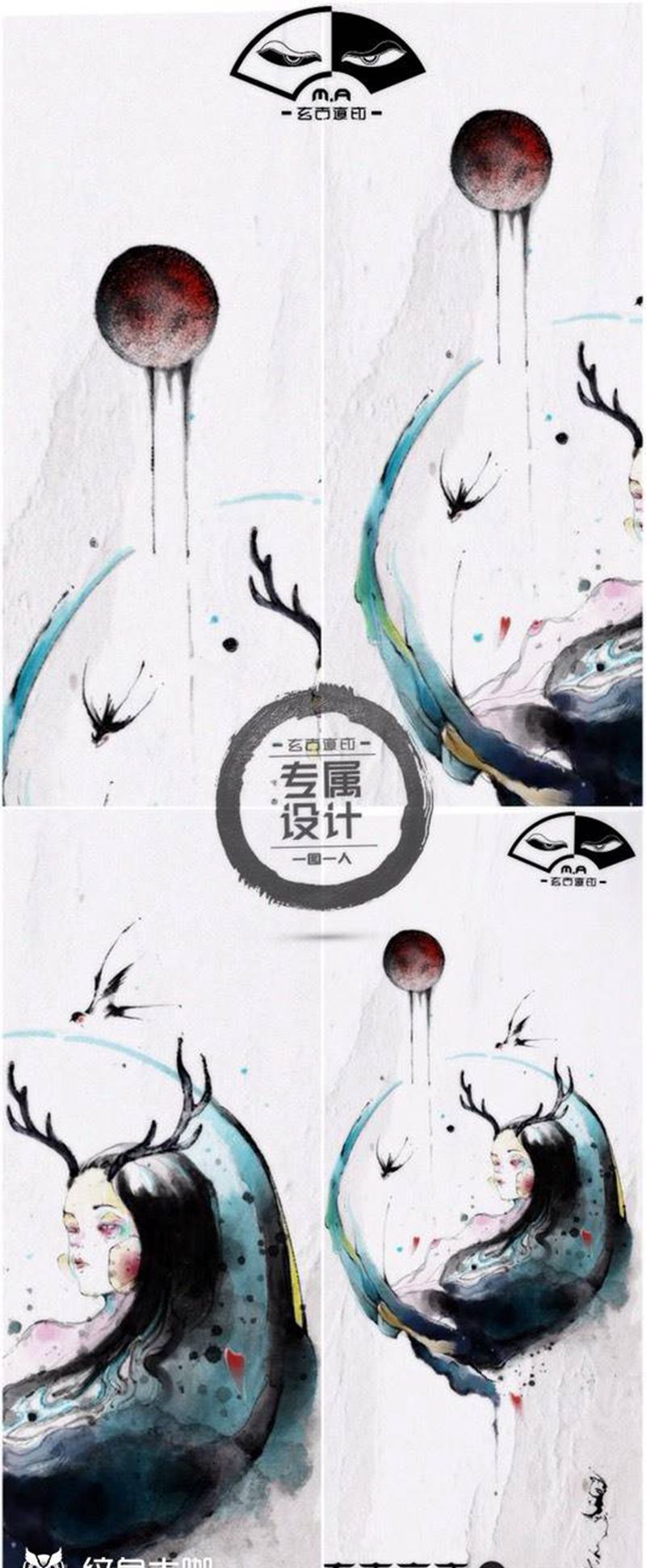 月亮纹身图片_手臂腿部水墨水彩手稿设计纹身图案