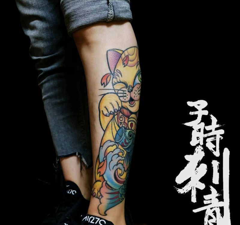 当前位置: 首页 >北京市纹身店-北京子时纹艺刺青工作室纹身图案>遮盖纹身图片_腿部Old School遮盖猫纹身图案