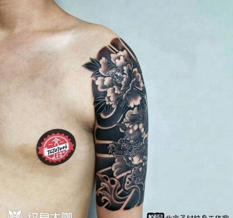 当前位置: 首页 >北京市纹身店-北京子时纹艺刺青工作室纹身图案>唐狮戏牡丹纹身图片_手臂老传统纹身图案