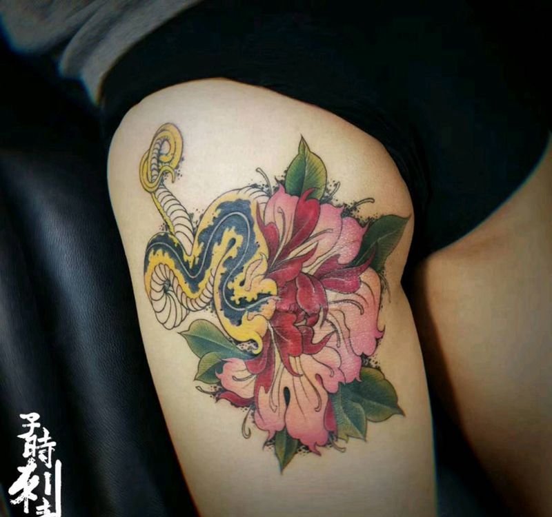 蛇盘牡丹纹身图片_臀部老传统新传统蛇盘牡丹纹身图案