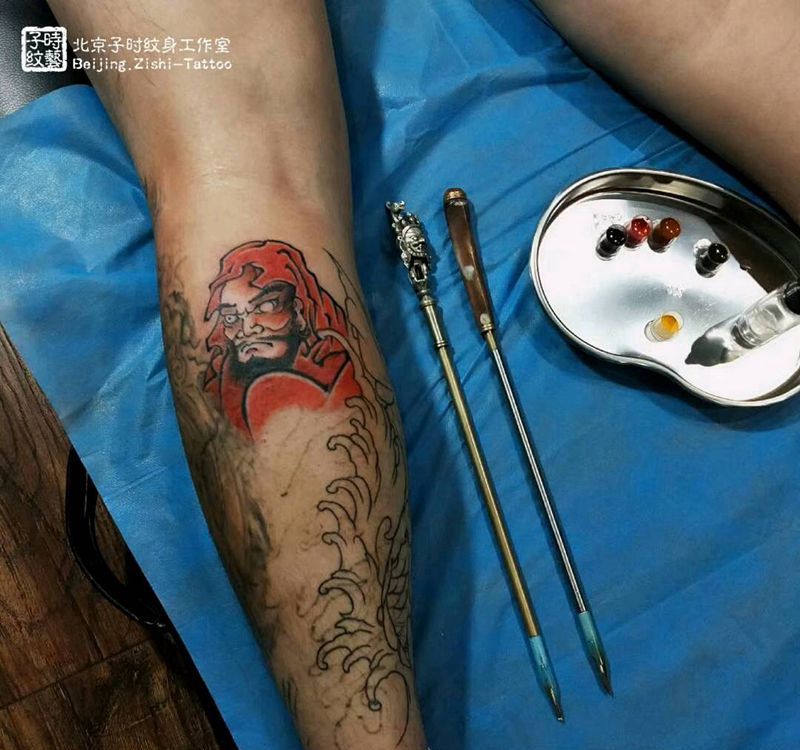 当前位置: 首页 >北京市纹身店-北京子时纹艺刺青工作室纹身图案>达摩纹身图片_腿部老传统手针纹身图案