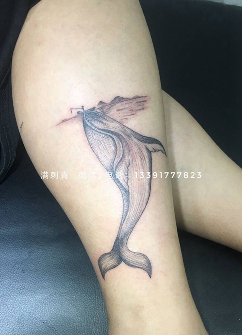 清新大鲨鱼文身纹身图片_成品腿部清新纹身图案