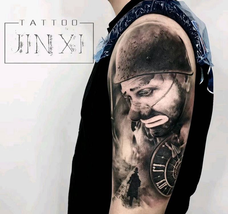 当前位置: 首页 >北京市纹身店-金玺刺青纹身图案>小丑纹身图片_手臂欧美写实小丑纹身图案