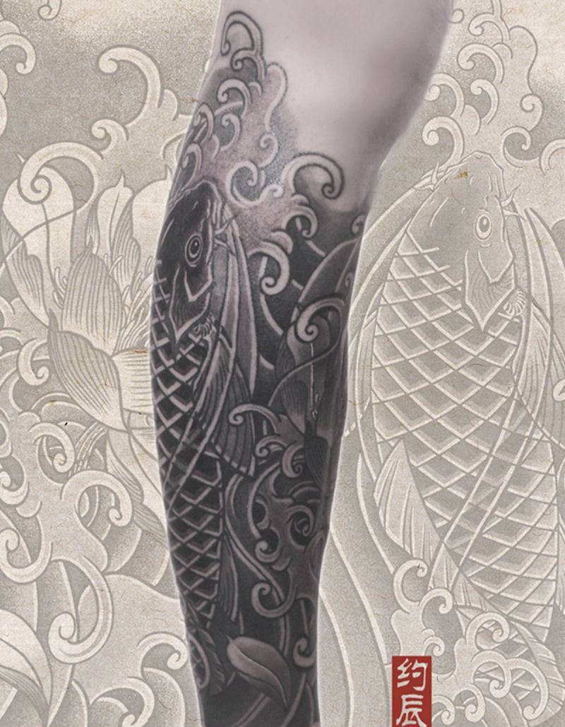 包小腿,鲤鱼,荷花纹身图片_腿部老传统新传统纹身图案