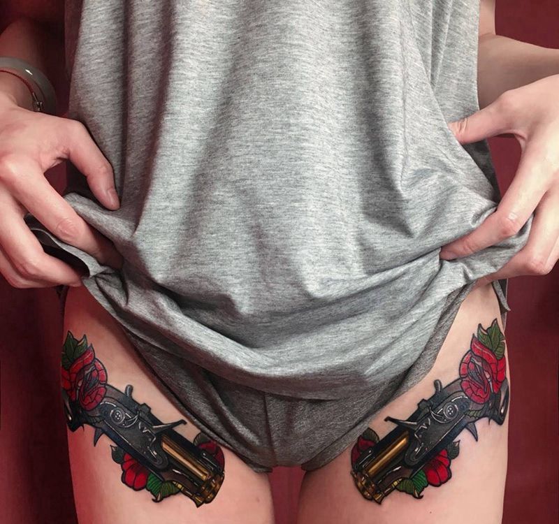 当前位置: 首页 >北京市纹身店-鹤见刺青処纹身图案>【遮疤双枪】纹身图片_